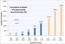 As of January 2006, about two thirds of worldwide structural genomics (SG) output was made by PSI centers.[12] Of these PSI contributions over 20% represented new Pfam families, compared to the non-SG average of 5%.[12] Pfam families represent structurally distinct groups of proteins as predicted from sequenced genomes. Not targeting homologs of known structure was accomplished by using sequence comparison tools like BLAST and PSI-BLAST.[12] Like the difference in novelty as determined by discovery of new Pfam families, the PSI also discovered more SCOP folds and superfamilies than non-SG efforts. In 2006, 16% of structures solved by the PSI represented new SCOP folds and superfamilies, while the non-SG average was 4%.[12] Solving such novel structures reflects increased coverage of protein fold space, one of the PSI's main goals.[1] Determining the structure a novel protein allows homology modeling to more accurately predict the fold of other proteins in the same structural family.