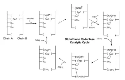 The catalytic process starts when the FAD is reduced by NADPH to accept one electron and from FADH. It then attacks the disulphide bond formed between 2 cysteine residues, forming one SH bond and a single S group. This S group will act as a nucleophile to attack the disulphide bond in the oxidised glutathione(GSSG), breaking it and forming a cysteine-SG complex. The first SG anion is released and then receives one proton from adjacent SH group and from the first glutathione monomer. Next the adjacent S group attack disulphide bond in cysteine-SG complex and release the second SG anion. It receives one proton in solution and forms the second glutathione monomer.