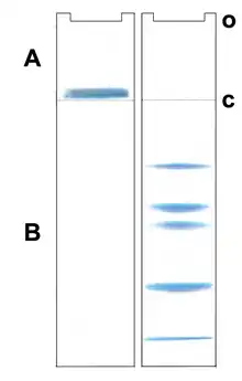 CN-PAGE (commonly referred to as Native PAGE) separates acidic water-soluble and membrane proteins in a polyacrylamide gradient gel. It uses no charged dye so the electrophoretic mobility of proteins in CN-PAGE (in contrast to the charge shift technique BN-PAGE) is related to the intrinsic charge of the proteins.[3] The migration distance depends on the protein charge, its size and the pore size of the gel. In many cases this method has lower resolution than BN-PAGE, but CN-PAGE offers advantages whenever Coomassie dye would interfere with further analytical techniques, for example it has been described as a very efficient microscale separation technique for FRET analyses.[4] Also CN-PAGE is milder than BN-PAGE so it can retain labile supramolecular assemblies of membrane protein complexes that are dissociated under the conditions of BN-PAGE.