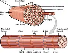 There are several different proteins that interact with actin in the body. However, one of the most famous types of motor proteins is myosin. Myosin will bind to these actins causing the movement of actin. This movement of myosin along the microfilament can cause muscle contraction, membrane association, endocytosis, and organelle transport. The actin microfilament is composed of three bands and one disk. The A band is the part of the actin that will bind to the myosin during muscle contraction. The I band is the part of the actin that is not bound to the myosin, but it will still move during muscle contraction. The H zone is the space in between two adjacent actin that will shrink when the muscle begins to contract. The Z disk is the part of the microfilament that characterizes the overall end of each side of the sarcomere, a structural unit of a myofibril.