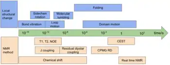 Protein nuclear magnetic resonance (NMR) is able to collect protein structural data by inducing a magnet field through samples of concentrated protein. In NMR, depending on the chemical environment, certain nuclei will absorb specific radio-frequencies.[54][55] Because protein structural changes operate on a time scale from ns to ms, NMR is especially equipped to study intermediate structures in timescales of ps to s.[56] Some of the main techniques for studying proteins structure and non-folding protein structural changes include COSY, TOCSY, HSQC, time relaxation (T1 & T2), and NOE.[54] NOE is especially useful because magnetization transfers can be observed between spatially proximal hydrogens are observed.[54] Different NMR experiments have varying degrees of timescale sensitivity that are appropriate for different protein structural changes. NOE can pick up bond vibrations or side chain rotations, however, NOE is too sensitive to pick up protein folding because it occurs at larger timescale.[56]