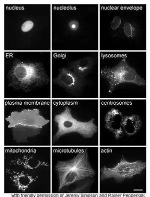 Other methods for elucidating the cellular location of proteins requires the use of known compartmental markers for regions such as the ER, the Golgi, lysosomes or vacuoles, mitochondria, chloroplasts, plasma membrane, etc. With the use of fluorescently tagged versions of these markers or of antibodies to known markers, it becomes much simpler to identify the localization of a protein of interest. For example, indirect immunofluorescence will allow for fluorescence colocalization and demonstration of location. Fluorescent dyes are used to label cellular compartments for a similar purpose.[60]