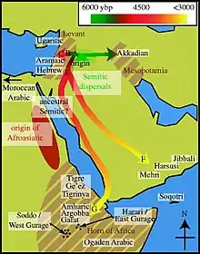 Edward Lipiński believes that support for an African origin is provided by what he describes as a possible relationship between an early Afroasiatic language and the Niger–Congo languages, whose Urheimat probably lies in Nigeria–Cameroon.[10] According to this theory, the earliest wave of Semitic speakers entered the Fertile Crescent via Israel and Syria and eventually founded the Akkadian Empire. Their relatives, the Amorites, followed them and settled Syria before 2500 BC.[11] Late Bronze Age collapse in Israel led the southern Semites southwards, where they reached the highlands of Yemen after the 20th century BC. Those crossed back to the Horn of Africa between 1500 and 500 BC.[11]