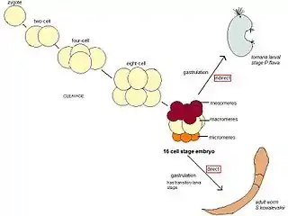 The enteropneusts have two developmental strategies: direct and indirect development. The indirect developmental strategy includes an extended pelagic plankotrophic tornaria larval stage, which means that this hemichordate exists in a larval stage that feeds on plankton before turning into an adult worm.[12] The Pterobranch genus most extensively studied is Rhabdopleura from Plymouth, England and from Bermuda.[13][14][15][16]