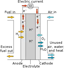 To function, the membrane must conduct hydrogen ions (protons) but not electrons as this would in effect "short circuit" the fuel cell. The membrane must also not allow either gas to pass to the other side of the cell, a problem known as gas crossover.[5][6] Finally, the membrane must be resistant to the reducing environment at the cathode as well as the harsh oxidative environment at the anode.