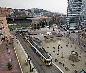 The station's southern platform (used by eastbound trains), on Yamhill Street, was located directly adjacent to the longtime printing plant of the city's major newspaper, The Oregonian,[3] until the plant's closure in 2015[4] and demolition in 2018.[5] As a reflection of this, TriMet chose "communication" as the theme for the public art at this station – known as Civic Stadium station at the time of its opening, in 1997 – "celebrating the importance of communication to the vitality of our city".[6]