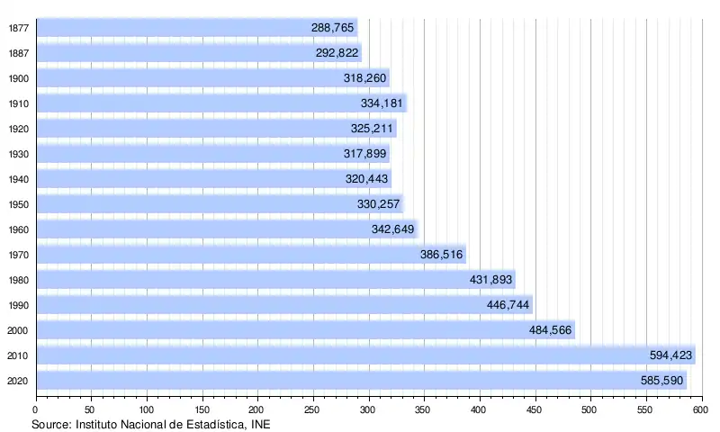 Castellón's capital is Castellón de la Plana (Valencian: Castelló de la Plana). The province had a population of 579,962 at the start of 2019,[2] 30% of whom were residing in the capital, 60% in its metropolitan area, and 85% along the coastline. As of the 2011 Census, the population had grown to 594,423 people, but has since declined.[3] The province, and in particular its idle large airport, has become a symbol of the wasteful spending prior to the 2008-14 Spanish financial crisis.