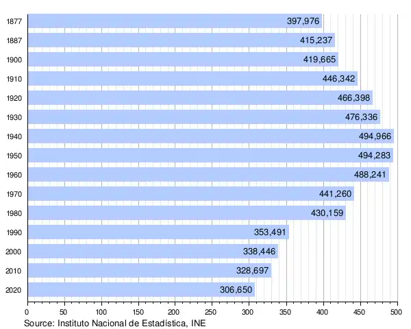 Of the province's population of 309,986 (2018), about 30 per cent in the capital, Ourense, with 105,000 inhabitants.[3][4] There are 92 municipalities in Ourense. Other than the capital the most important are O Barco de Valdeorras, Verín, Ribadavia, Allariz, A Rua, O Carballiño, Viana do Bolo, and Xinzo de Limia. As of 2018, Ourense has the lowest birthrate of any Spanish province, posting a population growth rate of -2,993.[5]