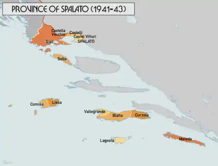 Province of Spalato (Italian: Provincia di Spalato) was a province of the Italian Governorate of Dalmatia, created in May 1941 during World War II (by the "Regio Decreto Legge del 18 maggio 1941"[1]). It lasted until September 1943.