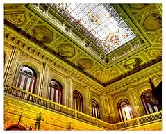 The decoration of the headquarters' interiors is inspired in the Palace of Versailles, for which a wide variety of techniques and designs were applied. Inside the building stands the figure of Mercury, protector of merchants and guilds.