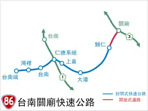 Provincial Highway 86 (Chinese: 台86線) is an expressway, which begins in South District, Tainan on Provincial Highway No. 17 and ends in Guanmiao District, Tainan on National Highway No. 3 in Taiwan.