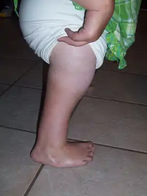 Proximal femoral focal deficiency (PFFD), also known as Congenital Femoral Deficiency (CFD),[1] is a rare, non-hereditary birth defect that affects the pelvis, particularly the hip bone, and the proximal femur. The disorder may affect one side or both, with the hip being deformed and the leg shortened.