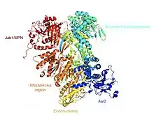 Common research methods for studying the structure and functions of Prp8 are co-immunoprecipitation and Western blot analysis. The structure of Prp8 includes a RNA recognition motif, a MPN / JAB ubiquitin-binding domain near the C-terminus, and a nuclear localization signal (NLS) that tags the protein to be moved to the cell nucleus.[3] The crystal structure of Prp8 protein (residues 885–2413) reveals tightly associated domains that resemble an intron reverse transcriptase and a type II restriction endonuclease. This implies that Prp8 might play roles similar to both the creation of cDNA and in cutting the DNA during splicing.