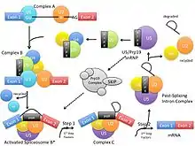 Pre-mRNA splicing involves two trans-esterification reactions and attacks by hydroxyl groups within the spliceosome. In these reactions, spliceosomal intron removal is catalyzed by the spliceosome using the same mechanism as Group II introns.[2] There are five key small nuclear RNA-protein complexes (snRNP) involved in this process. All of the snRNPs together contribute about 50 proteins to the core spliceosome.[2] The Prp8 gene encodes for a protein that is a central part of the U5 snRNP and the U5-U4/U6 tri-snRNP. The U5-U4/U6 tri-snRNP is involved with Complex B, the pre-catalytic spliceosome, where the U5 snRNP binds to exons at the 5’ end of the mRNA before shifting to introns. The U5 snRNP is involved with Complex C, the catalytic spliceosome, where the U5 snRNP binds to an exon at the 3’ splice site and the lariat loop forms. The U5 snRNP is also involved with Complex C*, the post-catalytic spliceosome, where it remains bound to the lariat before the spliced RNA is released and the snRNPs are recycled.