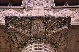 The Guaranty Building and Sullivan's preceding Wainwright Building share many traits: Simplicity of form, plan similarity, and richness of detail.[10] Yet the Guaranty is said to be a radical departure from the Wainwright because the expression "of the underlying steel-frame construction behind the red terra-cotta tiles is more apparent here than in the Wainwright."[3] Similarly, David Van Zanten found the Wainwright Building's ornament performed a "traditional, even if exceptionally conspicuous, role in its design" compared to the Guaranty.[11]