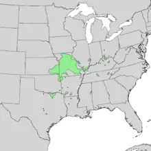 Prunus rivularis is native to the United States; found in California, Arkansas, southern Illinois, south-eastern Kansas, Kentucky, northern Louisiana, Mississippi, Missouri, southwestern Ohio, Oklahoma, Tennessee, and Texas.[1] It can be found in a variety of places in nature: places like creeksides, wooden canyons, bottom of valleys and flooded plains.[6][7] This plant grows on limestone-based woodland or sandy soil. The moisture of the soil can vary between dry and moist, though the soil has to be well drained. (In other words, water is readily removed from the soil). The preferred pH is slightly more alkaline (greater than 7.2). It is hardy to levels of 6–9 because of its varied distribution.[6] This implies that the USDA zones, or geographically designated zones of temperature of which plants can grow under, are found in the southern U.S.[8] The temperature ranges between -10° and 30° Fahrenheit. Because of the range of dispersion, the amount of precipitation this plant can experience is anywhere from 610 to 1,220 mm (24 to 48 in) per year.[6]