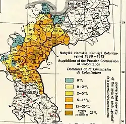 By 1913, the SC had bought up about 5.4% of the land in West Prussia and 10.4% in Posen.[1] By then, 450 new villages were founded, a total area of 438,560 ha was purchased, of which 124,903 ha were purchased from Poles.[24] In 1914, Germans owned 59% of land in Province of Posen, while making up for about 40% of population in 1890.[1]