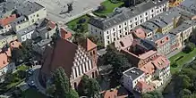 Bird's-eye view with the cathedral (left), Przyrzecze street (foreground) and parallel Jezuicka street (backdrop)