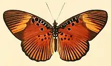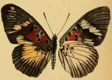 The numerous forms of this group [ Pseudacraea eurytus group - eurytus, dolomena and rubrobasalis] may be known at once by the long, distinct black streaks on the interneural folds of the hindwing; forewing always with 5 rounded black spots in the cell and 1 or 2 at the base of cellule 1 b. The butterflies stand in interesting but very complicated mimetic relations with the Planema species which fly together with them. In the males the forewing is more pointed with the distal margin straight or slightly in the females the forewing very obtusely rounded with the distal margin curved. Ps. dolomena is distinguished from all the others by the large basal dots of the forewing, which are surrounded by white or whitish rings. -dolomena Hew. (46 c). Forewing in the male above with very large red hindmarginal spot, covering cellules l-2 and the posterior longitudinal half of the cellUand with a yellow subapical band, which at least in cellule 3 forms a large spot and usually has also a streak in cellule 2, nearly joined to the hindmarginal spot; in the apical part the black interneural folds are only indistinctly edged with grey; the hindwing is yellow-red above with black costal margin and broad black marginal band. In the female the forewmg is black-brown at the base as far as the hindmargin and has in the middle of the hindmargin a light yellow spot, which is only about 7 mm. in breadth but reaches at least to the middle of cellule 2; the subapical band is light yellow; the hindwing is light yellow as far as the middle and then very broadly blackish. -. Sierra Leone to Angola. albostriata Lathy has the hindwing marked as in the type-form, but the forewing differs in the absence of the subapical band, while its apical part bears long white stripes. Uganda. -rubrobasalis Auriv.[ now species Pseudacraea rubrobasalis agrees with albostriata as regards the forewing, but has in the female a sharply defined black marginal band, only 4 mm. in breadth, on the hindwing. Southern Congo: Katanga - pharsa Fruhst. was described from a male in which the subapical band of the forewing is white and the hindwing has a sharply defined marginal band only 1-2 mm. in breadth. Possibly the male of rubrobasalis. German East Africa. - usagarae Stgr. Both wings in the female red-brown above at the base; the red-brown colour on the forewing covers almost the whole of the cell and the base of cellules l-2; somewhat behind the middle of the hindmargin is placed a narrow light yellow band, which, however, extends scarcely or not at all beyond vein 2; the subapical band of the forewing and the broad median band of the hindwing are also light yellow; the marginal band of the hindwing is 6-8 mm. in breadth and not sharply defined proximally. The male is not known to me with certainty. German East Africa. [3]