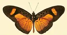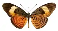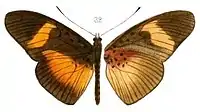 - ab. epigea Btlr. The subapical band and the broad hindmarginal spot of the forewing are light orange-yellow as in the hindwing the same, the upperside only with a dark marginal band 3-4 mm. in breadth. Among the type-form.