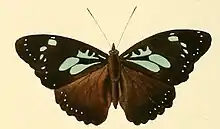glaucina group -the only species of this group differs very considerably from all others and is quite isolated. P. glaucina Guen. Forewing black with two large green spots at the base of cellules 1 b and 2; cell short, green with three black spots at the anterior margin; midway between the cell and the apex of the wing 5 small, free green spots in cellules 3-6 and 9, arranged in a curve; small greenish submarginal dots. Hindwing unicolorous black above, with a triangular chalk-white spot at the costal margin in cellule 7 and very small whitish submarginal dots; beneath dark grey, at the distal margin blackish and at the hindmargin yellowish white to beyond the middle. Madagascar; rare. [4]