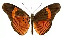 - neumanni Thurau (= hypoxantha Jord.) only differs in having the orange median band of the forewing somewhat broader, distinctly wider at the costal margin than at vein 4, the spot in cellule 1 b as long as that in 2, while the white median band of the hindwing reaches the inner margin, towards which it is distinctly widened; the inner margin is only yellowish between the white band and the anal angle. Uganda. Ps. gottbergi Dew. (46 b) has on the forewing a narrow, somewhat curved transverse band of almost uniform breadth, which reaches the hindmargin near the hinder angle, is composed of nearly quadrate spots and has a spot also in the apex of the cell. The hindwing is dark red-brown with black streaks and narrow black marginal band. The forewing on both surfaces with a thick black longitudinal streak in the cell and in cellules 1 b and 2. This rare species is coloured and marked almost exactly like Ps. ruhama (46 c) and Planema elongata (58 b, c). Cameroons to the southern Congo region.[4]