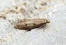 The wingspan of this moth is about 20 mm; its forewing coloration is a quite drab light taupe, mottled with slightly darker tiny specks. The head is covered in orange-yellow hairs.[7] Antennae reach about ¾ length of the long forewings, that are held in shallow roof-shaped position.[8] Dorsal surface of the abdomen has very narrow scales.[9]