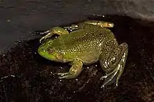Males measure 22–46 mm (0.9–1.8 in) and females 30–57 mm (1.2–2.2 in) in snout–vent length.[2][5] The body is robust. The head is broad and the snout is rounded. The tympanum is distinct. The forearms are robust with robust fingers; no webbing is present. The hind limbs are short and robust with extensively webbed toes. The body and the limbs are dorsally light to dark green, olive, or brownish. There are usually some darker spots or blotches of irregular form. A black or dark green stripe runs along the canthus rostralis; it can be narrow or broad and blot-like. The tympanum is olive, tan or light brown. The lateral surfaces of head, body, and thigh are light yellow. Ventral surfaces are white. Males have paired vocal sac.[2]