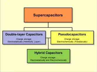 Pseudocapacitors store electrical energy faradaically by electron charge transfer between electrode and electrolyte. This is accomplished through electrosorption, reduction-oxidation reactions (redox reactions), and intercalation processes, termed pseudocapacitance.[1][2][3][4][5]