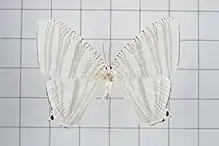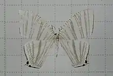 It is a white moth with black fasciations. Black dots are found on the tail margins of the hindwings.[5]
