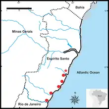 | The circles in red correspond to the cities where it is found and the star corresponds to the place where the holotype was found, in Espírito Santo. | |