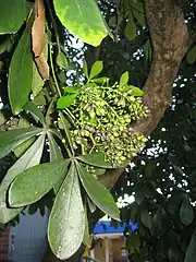 Houpara is a shrub or tree up to 6 m tall, with stout branches. The leaves are crowded towards the tips of branchlets, and are 3- to 5-foliolate. Juvenile plants have larger leaves than adults. The petioles are 5–15 cm long.