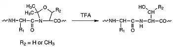 Pseudoprolines are a powerful tool for improving the quality of synthetic peptides.[12] Pseudoproline dipeptides have greatly increased the success rate for synthesizing both long and difficult peptides. Pseudoproline dipeptides can be introduced in the same manner as other amino acid derivatives. The routine use of pseudoproline (oxazolidine) dipeptides in the FMOC solid phase peptide synthesis (SPPS) of serine- and threonine-containing peptides leads to remarkable improvements in quality and yield of crude products and helps avoid unnecessary repeat synthesis of failed sequences.[13] Pseudoproline dipeptides have proven particularly effective in the synthesis of intractable peptides, long peptides/small proteins, and cyclic peptides, enabling in many cases the production of peptides that otherwise could not be made. These dipeptides are extremely easy to use: simply substitute a serine or threonine residue together with the preceding amino acid residue in the peptide sequence with the appropriate pseudoproline dipeptide (see the figure on your right). The native sequence is regenerated on cleavage and deprotection.[14][15][16]
