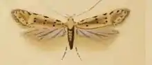The wingspan is 9–16 mm.[3] The head is whitish-ochreous. Terminal joint of palpi shorter than second. Forewings whitish ochreous, partly suffused with pale brownish-ochreous; usually some black scales on a basal dot, two or three costal marks, and round termen in cilia; two black dots transversely placed in disc at 1/4; stigmata black, first discal above plical, another black dot below second discal. Hindwings 1, light grey. The larva is yellowish-green; dots black;head pale brown.[4]