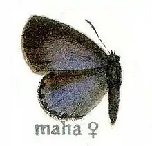 In a female from Poona, now before me, the fore wing on the upper-side has the basal half silvery blue, the outer half black; on the hind wing, however, the blue colour extends almost to the termen which is only narrowly edged with diffuse dusky black.
