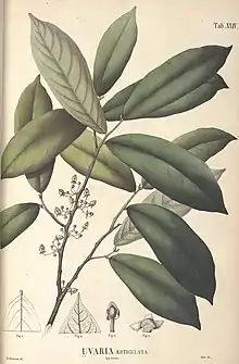 | Botanical illustration of Pseuduvaria reticulata using the synonym Uvaria reticulata | |