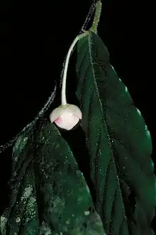 It is a small tree reaching 6 meters in height. The young, yellow-brown branches are sparsely to densely covered with long soft hairs. Its branches have sparse lenticels. Its egg-shaped to elliptical, papery leaves are 11-20 by 5-9 centimeters. The leaves have rounded to heart-shaped bases and tapering tips, with the tapering portion 2-24 millimeters long. The leaves are nearly hairless on their upper surface covered with long soft hairs on their lower surface. The leaves have 8-14 pairs of secondary veins emanating from their midribs. Its very densely hairy petioles are 3-5 by 1.5-2.5 millimeters with a broad groove on their upper side. Its solitary Inflorescences occur on branches, and are organized on very densely hairy peduncles that are 4 by 0.6 millimeters. Each inflorescence has 1-2 flowers. Each flower is on a very densely hairy pedicel that is 31-40 by 0.7 millimeters. The pedicels are organized on a rachis up to 5 millimeters long that have up to 2 bracts. The pedicels have a medial, very densely hairy bract that is up to 1 millimeter long. Its flowers are unisexual. Its flowers have 3 free, triangular sepals, that are 2.5-3.5 by 2-3 millimeters. The sepals are hairless on their upper surface, densely hairy on their lower surface, and hairy at their margins. Its 6 petals are arranged in two rows of 3. The oval, outer petals are 6-7 by 5.5-6.5 millimeters with hairless upper and very densely hairy lower surfaces. The oval inner petals have a 1-1.5 millimeter long claw at their base and a 7.5-9 by 7-9 millimeter blade. The inner petals have flat bases and pointed tips. The inner petals are hairless on their upper surface except at the margins of the apex, and very densely hairy on their lower surfaces. The male flowers have up to 153 stamens that are 1.3-1.6-0.8 by 1-1.2 millimeters. Female flowers have up to 40 carpels. Each carpel has up to 1-2 ovules. The fruit occur in clusters of up to 3 and are organized on densely hairy peduncles that are 5 by 2 millimeters. The fruit are attached by densely hairy pedicles that are 38-40 by 1 millimeters. The orange, oval to elliptical fruit are 12-15 by 10 millimeters. The fruit are smooth, and very densely hairy. Each fruit typically has 1 spherical, wrinkly seed that is 7.5 by 7 by 1.1 millimeters. Each seed has a 1.2 by 0.3 millimeter elliptical hilum.[5][4]