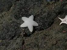 The slime star breeds in the summer, with a female releasing a small number of eggs into the water. Nearby males then release sperm and the fertilised eggs rise to the surface of the water. They are bright orange or yellow and are wrapped in a gelatinous membrane. They become planktonic and pass through several developmental stages over the course of about 25 days. They then undergo metamorphosis into juvenile starfish and settle onto the seabed.[3][4]