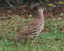 The largest African spurfowl,[7] Erckel's spurfowl is 38–43 cm (15–17 in) in length,[2] with females being slightly smaller than males.[8] Males grow to 1.05–1.59 kg (2.3–3.5 lb), based on a sample of three specimens, and a single female specimen was observed to weigh 1.136 kg (2.50 lb).[2] Males and females have similar plumage. The body is covered with stripes of chestnut-color, on its upperside and underside. It has a black face and bill, a chestnut-colored head top and back of neck, and yellow legs. It has white ear coverts and a single streak of white behind its eye.[8]