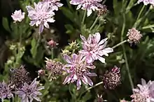 Form is a shrub up to one meter in height. Its stems are grey, with simple leaves of pale green-grey, both are hairy.[3] The inflorescence is a cushion-like head of pale pink flowers at the end of long stems.[4] It blooms in early summer, which is late with respect to other species in its environment. As summer progresses, the flower head becomes a ball of whitish chaffy seeds.