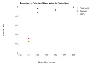 Preceding the analysis of mass spectra data obtained by analyzing samples found in meteorites, it was inferential at best to accredit 244Pu as being the nuclide responsible for the fissiogenic xenon found. However, an analysis of a laboratory sample of 244Pu compared with that of fissiogenic xenon gathered from the meteorites Pasamonte and Kapoeta produced matching spectra that immediately left little doubt as to the source of the isotopic xenon anomalies. Spectra data was further acquired for another actinide isotope, 244Cm, but such data proved contradictory and helped erase further doubts that the fission was appropriately attributed to 244Pu.[11]