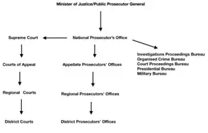 Article 13(1) of the Act on the Public Prosecutor's Office establishes the Public Prosecutor General as being “in charge”[24] of the Public Prosecutor's Office which consists of the entire apparatus of the Polish prosecution service.[1] Under Article 14(1), the National Public Prosecutor is the Prosecutor General's first deputy. The Prosecutor General may delegate the exercise of their powers and tasks to the National Public Prosecutor or another specified deputy.[25] Subject-specific branch divisions and departments are established through the office of the National Public Prosecutor.[26] Examples include the Branch Division of the Department for Organised Crime and Corruption[27] and the Department for Military Matters.[28] Below the National Public Prosecutor's office are, in order of superiority, offices of provincial public prosecutors;[29] regional public prosecutors;[30] and district public prosecutors.[31] Each office reports to the immediately superior office in the hierarchical chain.[32]