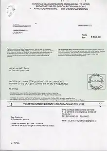 In Ireland, a television licence is required for any address at which there is a television set. Since 2016, the annual licence fee is €160.[1] Revenue is collected by An Post, the Irish postal service. The bulk of the fee is used to fund Raidió Teilifís Éireann (RTÉ), the state broadcaster. The licence must be paid for any premises that has any equipment that can potentially decode TV signals, even those that are not RTÉ's. The licence is free to anyone over the age of 70, some over 66, some Social Welfare recipients, and the blind. The fee for the licences of such beneficiaries is paid for by the state. The current governing legislation is the Broadcasting Act 2009, in particular Part 9 "Television Licence" and Chapter 5 "Allocation of Public Funding to RTÉ and TG4". Devices which stream television via internet do not need licences, nor do small portable devices such as mobile phones.[2]
