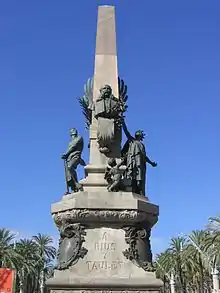 Later, between 1897 and 1901, was built at the entrance to the Parc de la Ciutadella Rius i Taulet Monument, who was mayor during the Exhibition and one of the main promoters of the project designed by the architect Peter Falqués and the sculptor Manuel Fuxà; also participated Eusebi Arnau, author of the figure of Barcelona. The monument consists of a pedestal, which includes both sides of bronze shields representing the four major projects promoted by the mayor: Parc de la Ciutadella, Universal Exhibition, Columbus Monument and Gran Via the Catalan Parliament. The base is an obelisk where the bust of the mayor, surrounded by two figures, one Labour and one allegory of Barcelona, offered a branch of palm. On the back is a winged Fame, and there are also three small geniuses symbolizing Industry, Science and Art.[33]