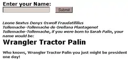 A Comedy Central writer joked that "she's a pit bull who wears lipstick for some reason!" (in response to her statement at the 2008 Republican National Convention that the difference between a pit bull and a hockey mom was lipstick).[162] In addition, David Harrington's "Sarah Palin Baby Name Generator"[163] generates hunting, industrial, hockey-related, and other idiosyncratic personal names from names that are supplied to it.[164]