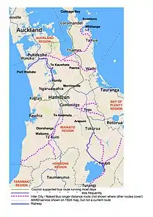 | Hamilton-Taumarunui | 25 and 26 | In July 2022 the Taumarunui health shuttle (see below) was made available to fare paying passengers on a trial basis.[175] From Monday 13 February 2023 the 26 Te Kuiti Connector links Te Kuiti to Wintec's Rotokauri campus in Hamilton.[176] | ||
