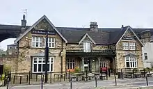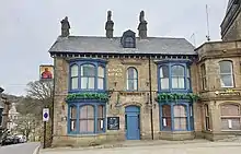 A three-storey millstone grit building on the Market Place from around 1800. It was originally known as the New Sun Hotel and in the late 1840s as the New Inn and Yorkshire Commercial Hotel. It has been run by Robinsons Brewery since 1838.[9] |