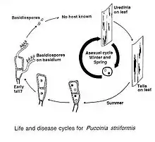 Puccinia striiformis var. striiformis is a plant pathogen. It causes stripe rust on wheat, but has other hosts as well. The species is common in Europe and in more recent years has become a problem in Australia.[1] Infection can cause losses of up to 40%, and the fungus will infect both winter wheat and spring wheat.[2] The taxonomy of Puccinia striiformis was revised in 2010. The commonly called stripe rusts on wheat and grasses were separated into four species based on molecular and morphological studies: Puccinia striiformis sensu stricto (on Aegilops, Elymus, Hordeum and Triticum spp.), Puccinia pseudostriiformis (on Poa spp.), Puccinia striiformoides (on Dactylis spp.) and Puccinia gansensis (on Achnatherum spp.)[3]