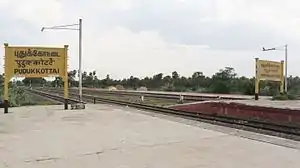 Pudukkottai railway station is a railway station in Pudukkottai town, serving the people of Pudukkottai District in Tamil Nadu. It falls under the operational limits of Madurai Railway Division of the Southern Railway zone. It is a major as well as an important passing station present on the Tiruchirappalli-Karaikkudi railway line.[1] It is under the station category B.
