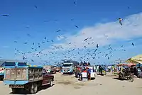 40 kilometres offshore is Isla de la Plata (named from its history as a pirate hideout, the Island of the Silver), also referred to as "The Poor Man's Galapagos."[1] There some species that also inhabit the Galapagos like the blue and red-footed booby, nazca booby, frigatebirds, albatross, pelican and other seabirds that are nesting in colonies can be found. The island is surrounded by coral reef and snorkeling is a popular activity. On the boat ride from Puerto Lopez to the island pods of dolphins can often be seen.